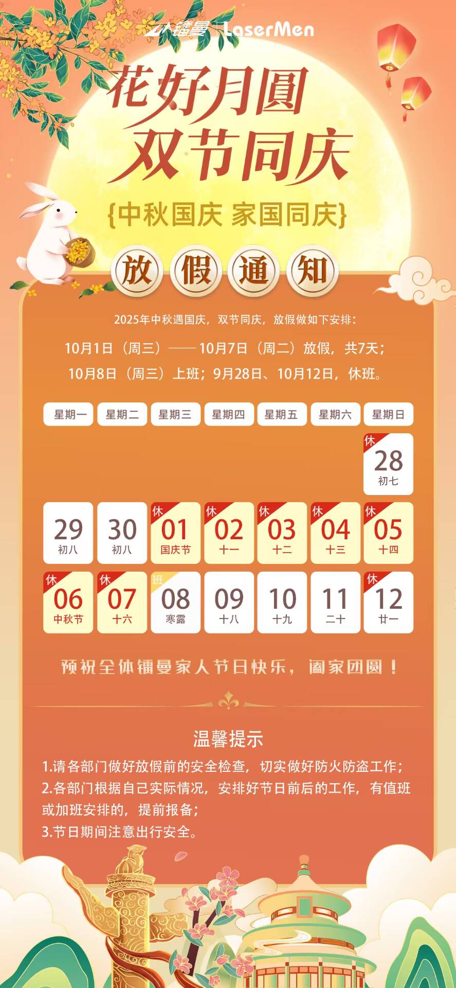 愿我们在 “家国同庆” 的美好氛围中,心怀感恩、勇担使命,以奋斗之姿共赴新征程,以实干之力书写新篇章。镭曼激光衷心祝愿伟大的祖国山河锦绣、繁荣昌盛!祝愿全体员工、合作伙伴及社会各界朋友双节安康、阖家幸福、万事顺意!